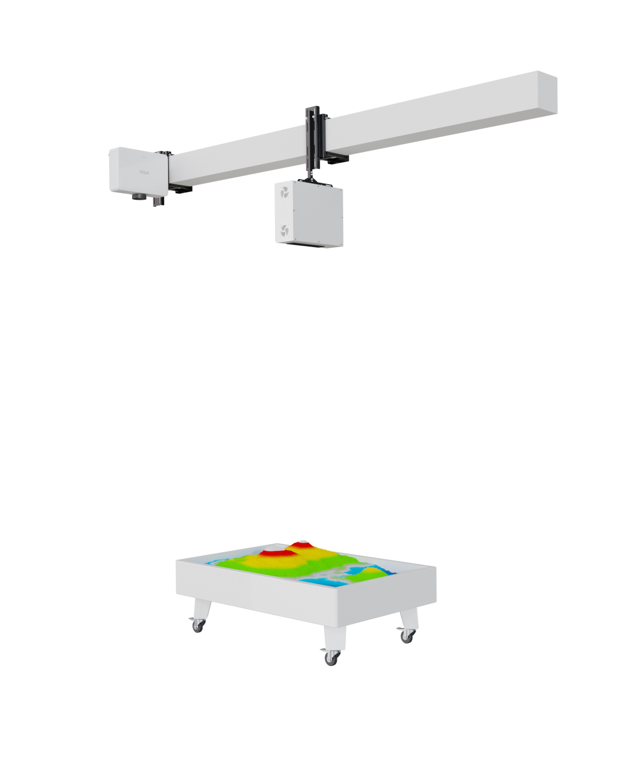 Die Lite-version sollte installiert werden vertikal, Kamera nach unten, parallel zum Boden, in der Mitte eine sand-container. Der Abstand zwischen den sand Behälterboden und der augmented-reality-sandbox-sensor sollte 170-180 cm. Der Bereich des projizierten Bildes ändert sich je nach der Höhe, in der die "augmented reality sandbox" installiert ist.